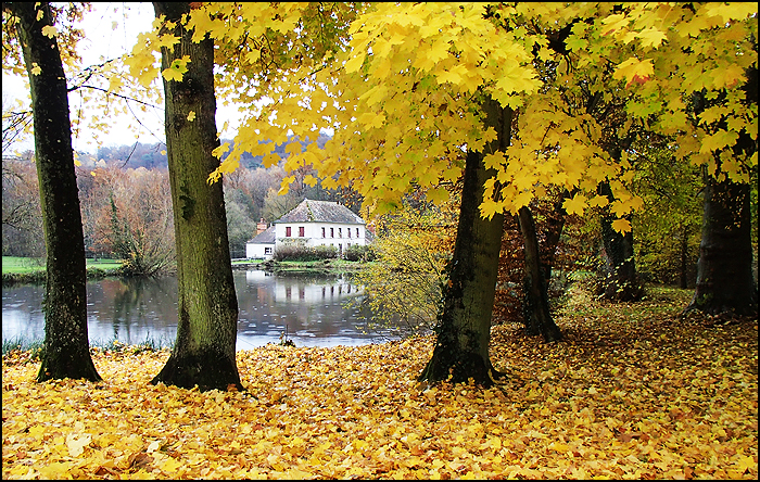Récompense après un dernier super petit saut et nous avons pris le chemin du retour. Nous avons traversé plein de flaques dans le chemin, Thorgal y allait tranquillement sans chercher à les éviter... arrêt et récompense dans l'une d'elle ^^ Nous avons fait quelques pas en épaule en dedans à chaque main... puis de retour à Brétigny, Thorgal a mangé son petit seau, pendant que je faisais des photos des jolies feuilles jaunes qui frimaient devant nous.